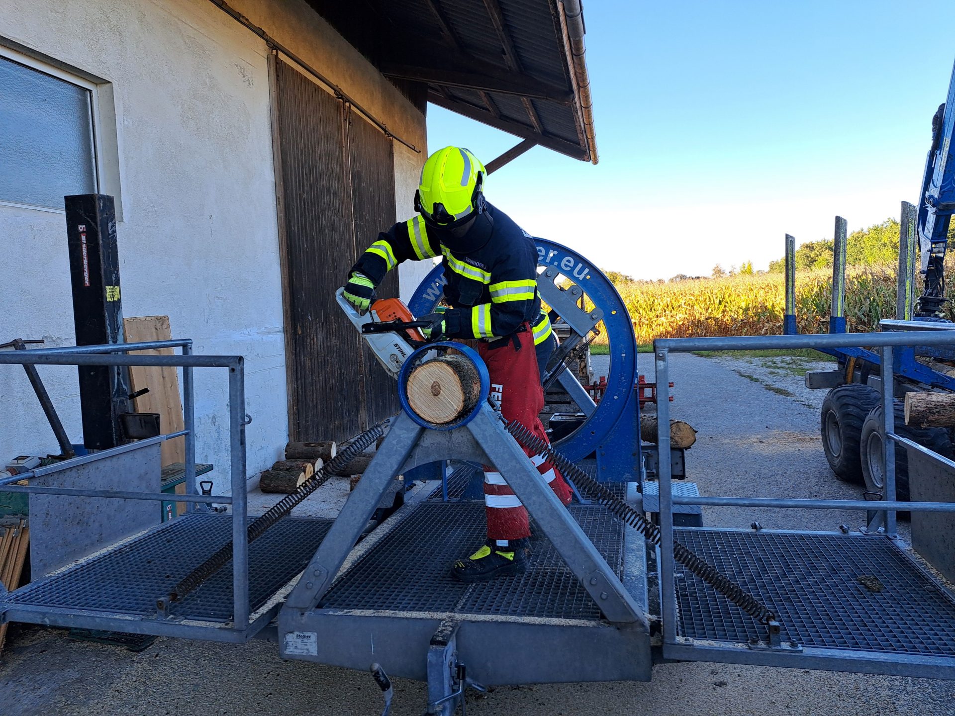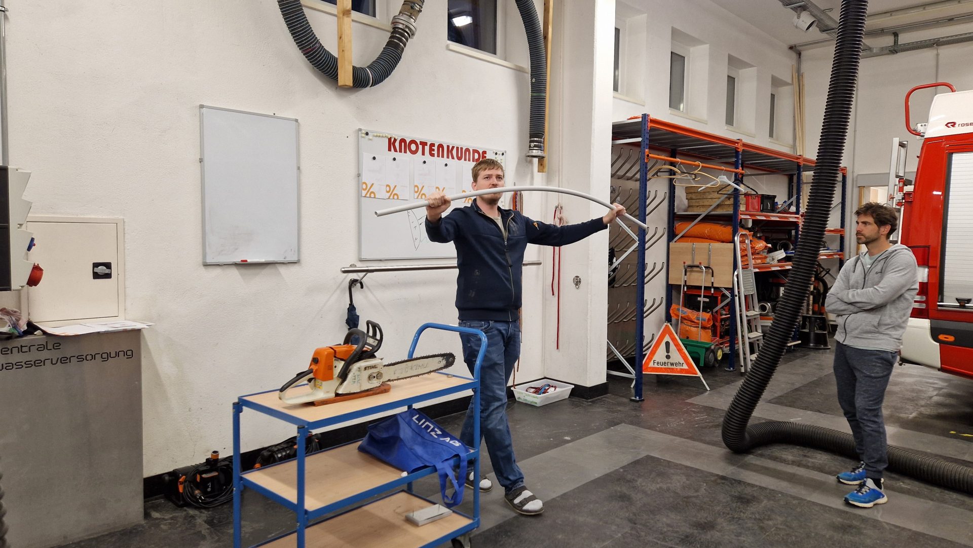 Ende September beschäftigten wir uns mit dem theoretischen Inhalt zu diesem Thema. Das Erkennen von der Zug- und Druckseite legt die weitere Vorgehensweise fest. Besonders wichtig ist dabei, wo der erste Schnitt gesetzt wird und auf welcher Seite des Baumes man selbst steht. Dieses Wissen konnte dann eine Woche später in der Praxis angewendet werden. Unter Verwendung eines Verspannungssimulators konnten das Erkennen der Zug- und Druckseite sowie die richtigen Schnitttechniken beübt werden.